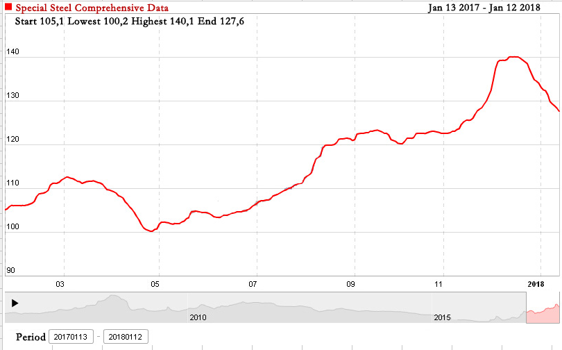 4.The index herein means weighted index , with the weight of each category made on the basis of its percentage of the total consumption of special steel over one year. The price adapted is the one of of major inventory markets by week.