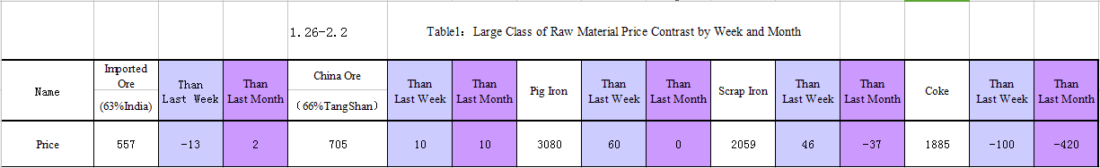 Remark: the data of imported ore come from 63% of Indian ore in Tianjin ports; the data of domestic ore is from 66% of Hebei iron power; the data of pig iron is from the average price including tax of pig iron for steel making ;The data of scrap steel is from the average price including tax of of scrap steel of 6-8mm thick; the data of coke from the ex-factory price (including tax) of the secondary metallurgical coke of Tangshan.