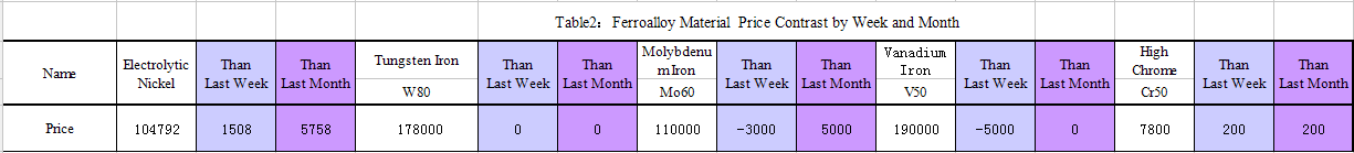 This week, among the five categories of raw materials, the prices of domestic ore,pig iron and scrap steel rose,imported ore and coke declined. The main ferromolybdenum,silica and ferrovanadium slightly declined, tungsten iron and high-manganese ,electrolytic nickel and high chromium remained flat.