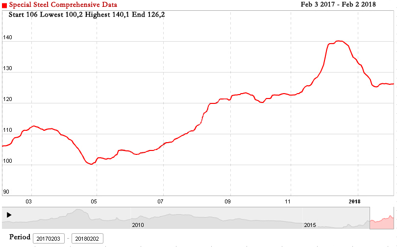 1. Up to 8nd December , the price index of special steel reached to 126, 0.11% down over last week and down 5.19% over last month.
