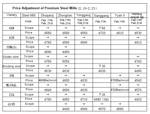 Price Adjustment of Premium Steel Mills(2018.2.10~2018.2.23)