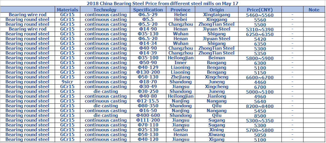2018 China Bearing Steel Price from different steel mills on May 17