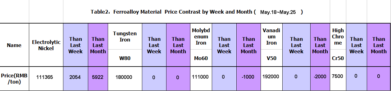 This week, among the five categories of raw materials, the prices of scrap steel, imported ore and pig iron decreased, domestic ore remained flat, and coke increased. The main tungsten iron, ferromolybdenum,high chromium and silica remained flat, high-manganese decreased, and electrolytic nickel increased.
