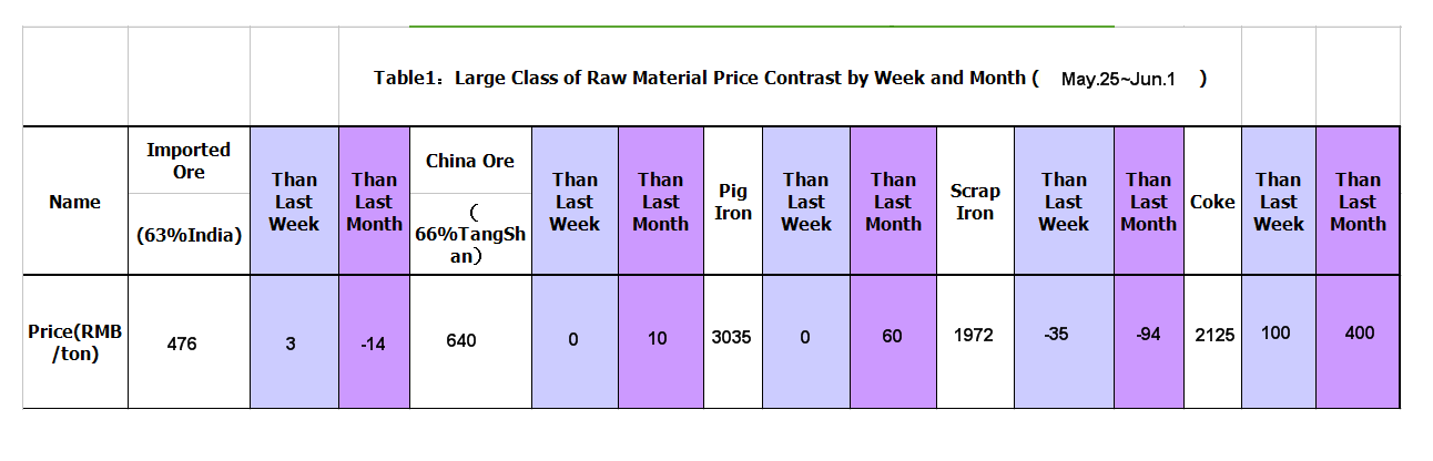 Remark: the data of imported ore come from 63% of Indian ore in Tianjin ports; the data of domestic ore is from 66% of Hebei iron power; the data of pig iron is from the average price including tax of pig iron for steel making ;The data of scrap steel is from the average price including tax of of scrap steel of 6-8mm thick; the data of coke from the ex-factory price (including tax) of the secondary metallurgical coke of Tangshan.