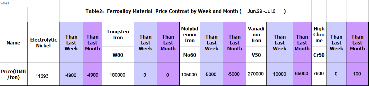 This week, among the five categories of raw materials, the prices of imported ore remained flat, scrap steel and domestic ore increased, coke and pig iron decreased. The main ferroalloy tungsten iron, high chromium and silica remained flat, ferromolybdenum and electrolytic nickel decreased, high-manganese and ferrovanadium decreased.