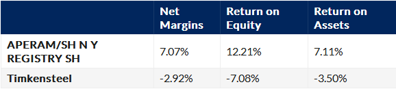 This table compares APERAM/SH N Y REGISTRY SH and Timkensteel’s net margins, return on equity and return on assets.