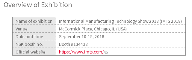 NSK Ltd. (NSK; Headquarters: Tokyo, Japan; President and CEO: Toshihiro Uchiyama) will exhibit its products and technologies at IMTS 2018, to be held at McCormick Place (Chicago) from September 10-15, 2018.