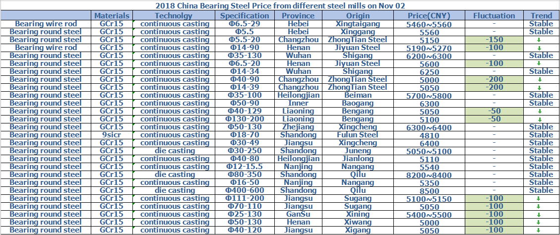2018 China Bearing Steel Price from different steel mills on Nov 02