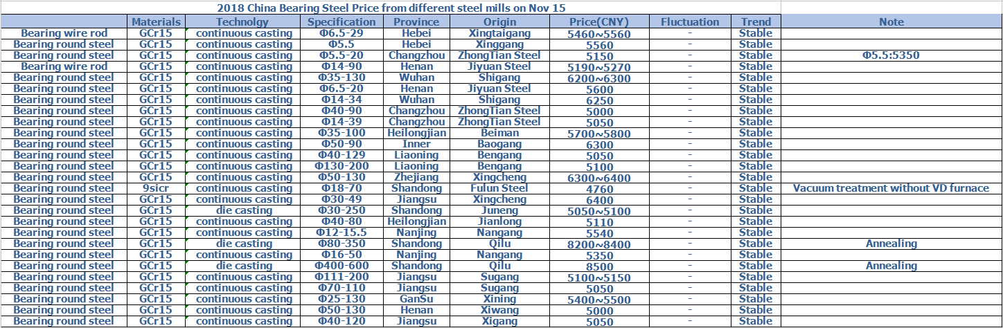 2018 China Bearing Steel Price from different steel mills on Nov 15