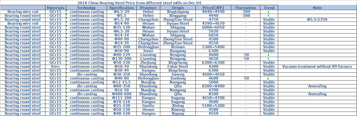 2018 China Bearing Steel Price from different steel mills on Dec 04