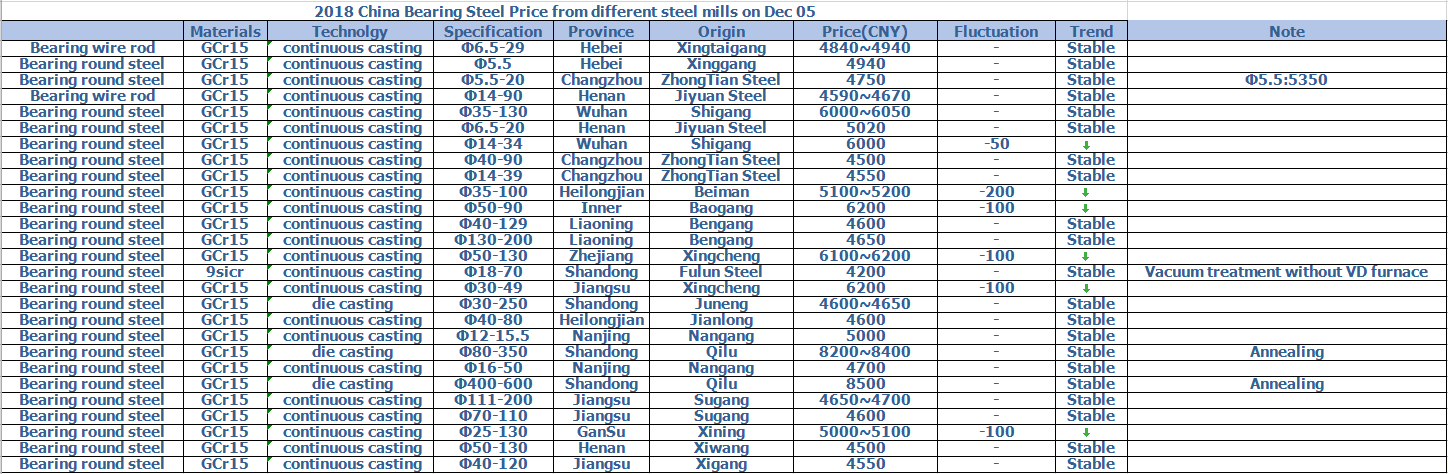 2018 China Bearing Steel Price from different steel mills on Dec 05