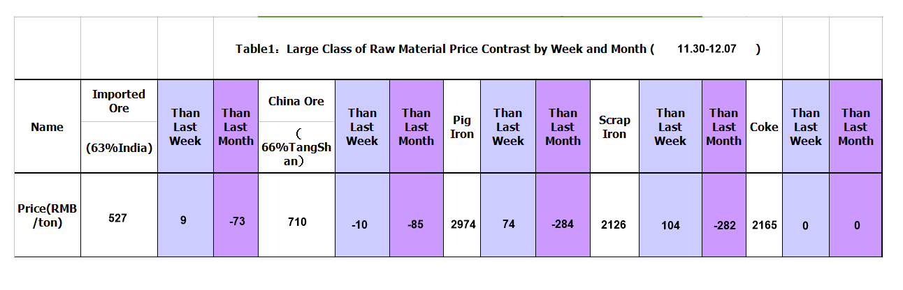 Remark: the data of imported ore come from 63% of Indian ore in Tianjin ports; the data of domestic ore is from 66% of Hebei iron power; the data of pig iron is from the average price including tax of pig iron for steel making ;The data of scrap steel is from the average price including tax of of scrap steel of 6-8mm thick; the data of coke from the ex-factory price (including tax) of the secondary metallurgical coke of Tangshan.