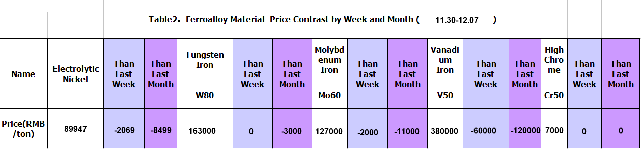 This week, among the five categories of raw materials, the prices of imported ore, scrap steel, pig iron increased, domestic ore decreased, coke remained flat. The main ferroalloy ferrovanadium and electrolytic nickel, ferromolybdenum decreased, tungsten iron, high chromium, high-manganese and silica remained flat.