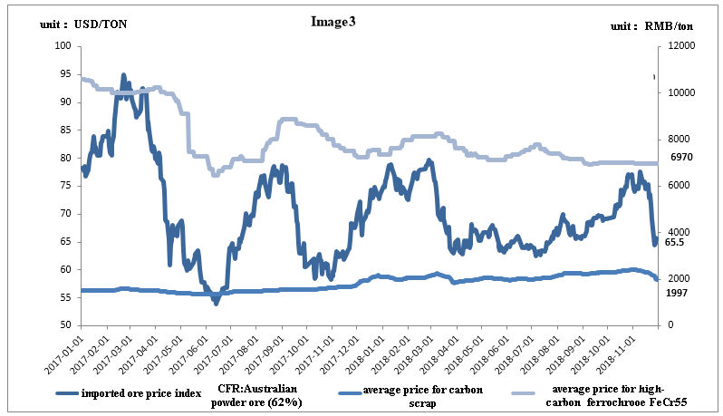 In November, the import minerals market fluctuated downwards. The price at the end of the month was 65.5 US dollars per dry ton. The overall ordinary carbon scrap market rose slightly. The average price at the end of the month was 1997 yuan/ton, up 17.1% from the end of last month. The high carbon ferrochrome market was weak. The average price at the end of the month is 6,970 yuan / ton.