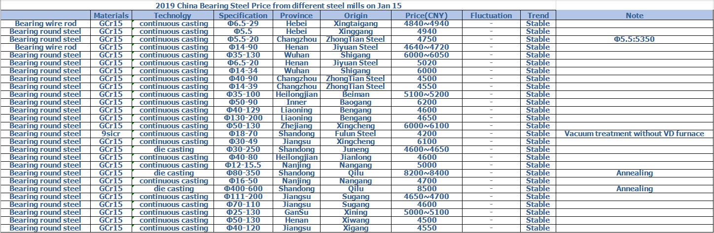 2019 China Bearing Steel Price from different steel mills on Jan 15