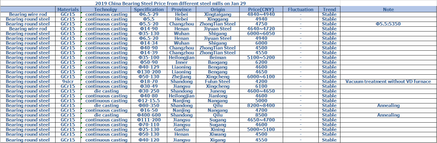 2019 China Bearing Steel Price from different steel mills on Jan 29