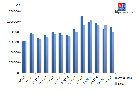 According to the statistics of the Special Steel Association, the output of crude steel for bearing steel in the main special steel enterprises in China from January to March of 2019 was 89.14million tons, compared with the same period last year. The ratio decreased by 19.69%; from January to March of 2019, the output of bearing steel in China's major Ute steel enterprises was 79.28 million tons, decrease of 19.70% compared with the same period of last year. See Figure 1.
