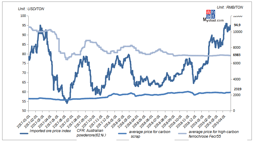 In April, the price of the imported ore market fluctuated and the port was significantly reduced. The price at the end of the month was 94.9 US dollars per dry ton. The domestic steel mill blast furnace is actively resuming production. Under the stimulation of high profits, the steel mill capacity utilization rate has reached a new high since 2018. Under the influence of the continuous enhancement of the fundamentals, the iron ore port inventory has fallen sharply, and both the US dollar and the spot price have risen. The carbon scrap market fluctuated upwards and was affected by the recovery of downstream construction sites. The finished products market was active, steel mills increased profits, production was positive, and scrap purchases were also positive. The average price at the end of the month was 2,319 yuan/ton, up 3.45% from the end of last month; The carbon ferrochrome market is weakly adjusted, and the average price at the end of the month is 6,983 yuan / ton. Considering the frequent temporary production restriction policies in the later period, the overall supply and demand pattern has changed. It is expected that the raw material market price will be weak in May.