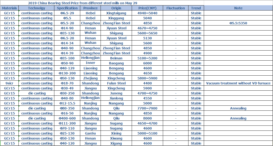 2019 China Bearing Steel Price from different steel mills on May 29