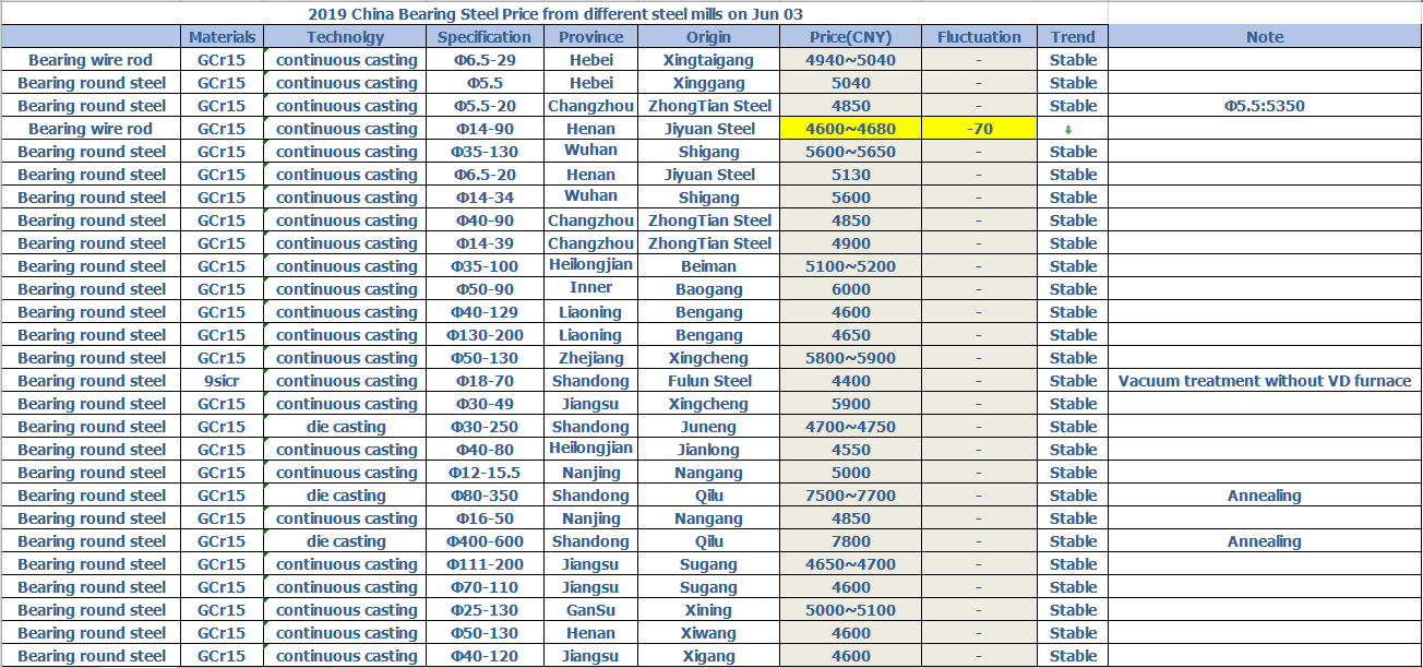 2019 China Bearing Steel Price from different steel mills on Jun 03