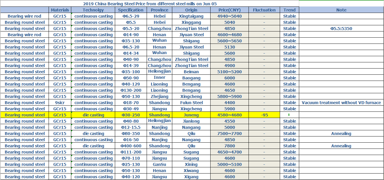 2019 China Bearing Steel Price from different steel mills on Jun 05