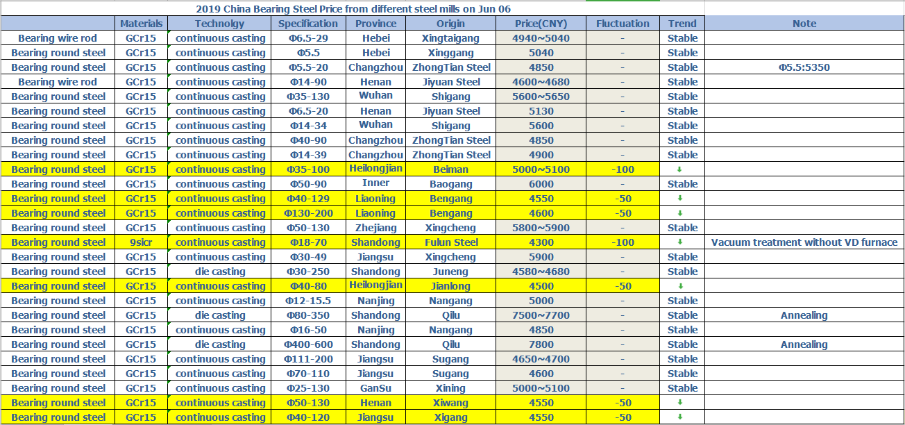 2019 China Bearing Steel Price from different steel mills on Jun 06