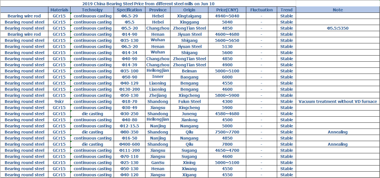 2019 China Bearing Steel Price from different steel mills on Jun 10