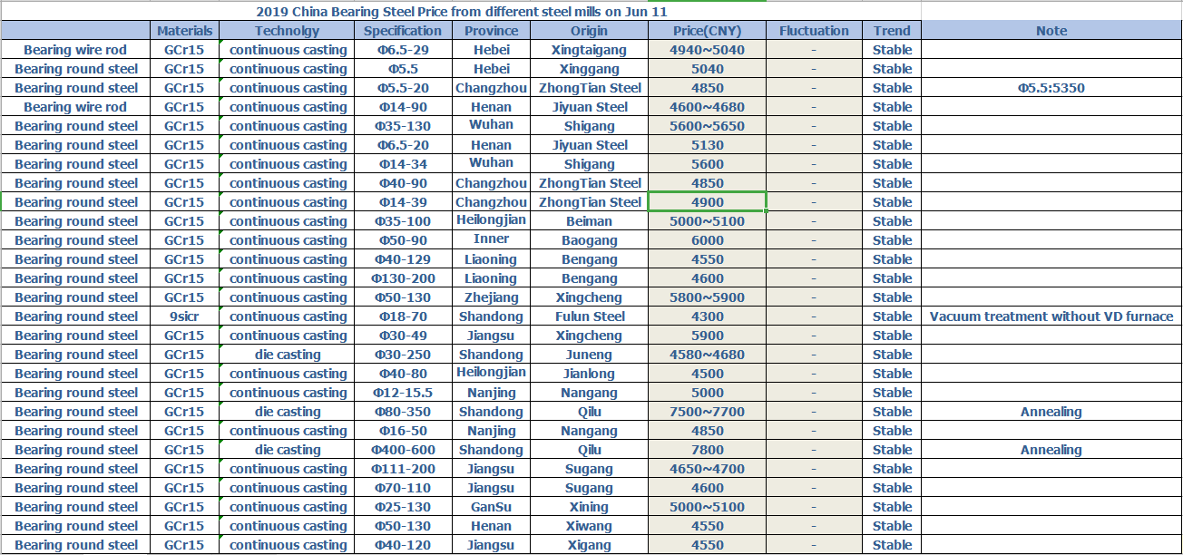 2019 China Bearing Steel Price from different steel mills on Jun 11
