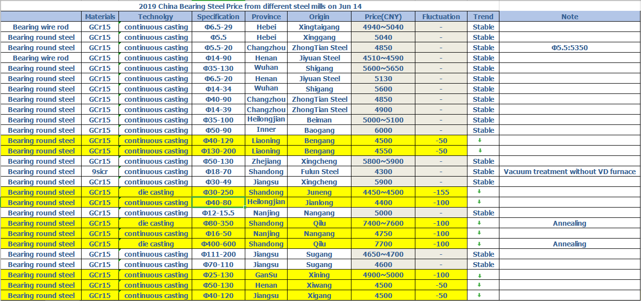 2019 China Bearing Steel Price from different steel mills on Jun 14