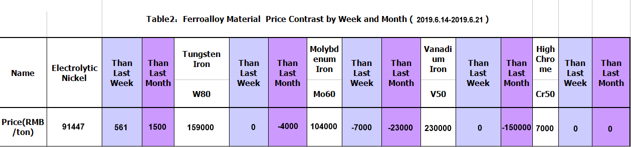 This week, among the five categories of raw materials, the prices of domestic ore and imported ore increased, coke,scrap steel and pig iron decreased. The main ferroalloy high chromium and electrolytic nickel decreased,high-manganese, tungsten iron, and ferrovanadium remained flat, silica and ferromolybdenum increased .