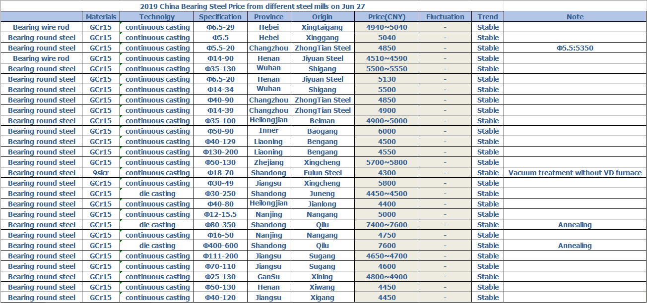 2019 China Bearing Steel Price from different steel mills on Jun 27