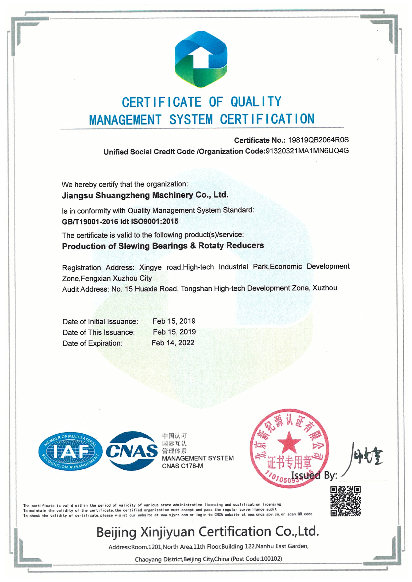 Jiangsu Shuangzheng Machinery Co.,Ltd. is specializing in standard and non-standard slewing bearing. They have passed GB/T19001-2016 idt ISO9001-2015 Quality System Certification.
