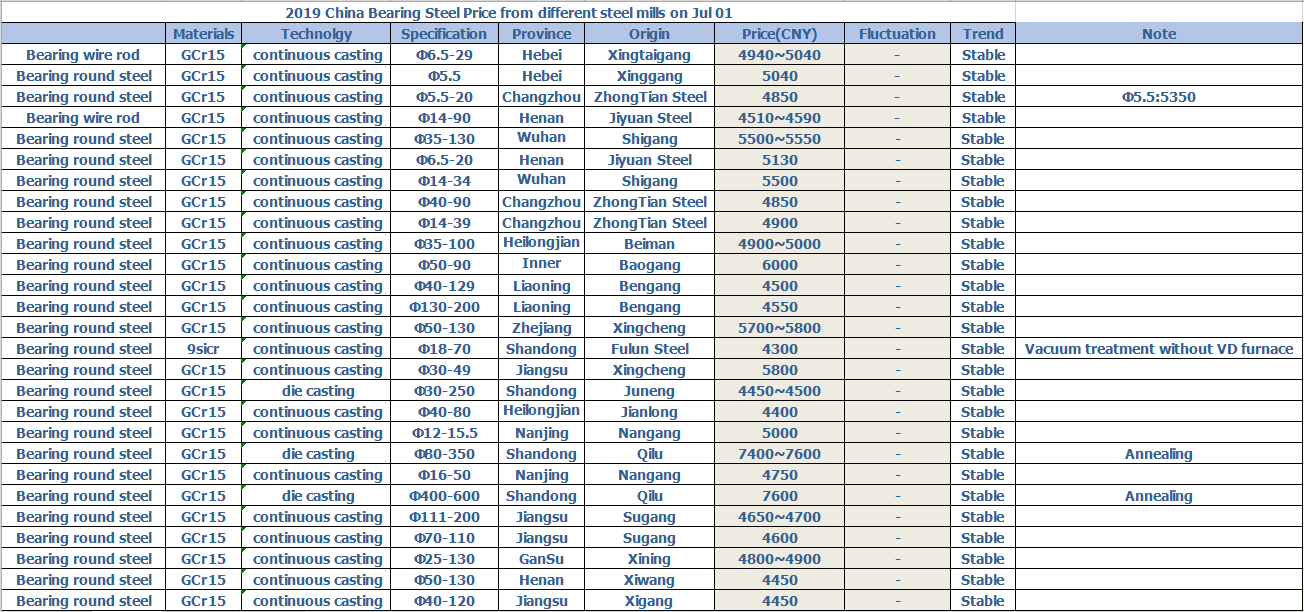 2019 China Bearing Steel Price from different steel mills on Jul 01