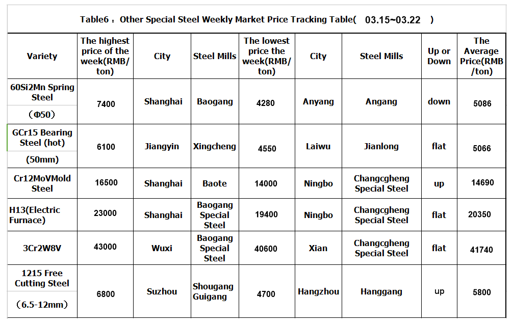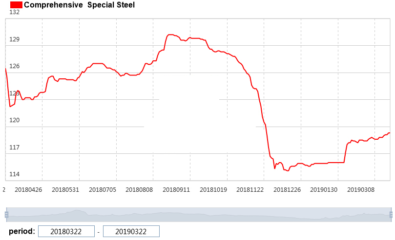 1. Up to 22nd March,the price index of special steel reached to 119.3, 0.36% up over last week and up 0.68% over last month.