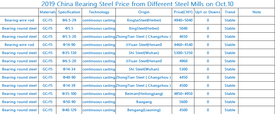 2019 China Bearing Steel Price from different steel mills on Oct 10