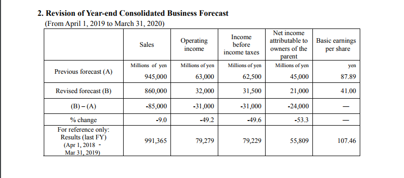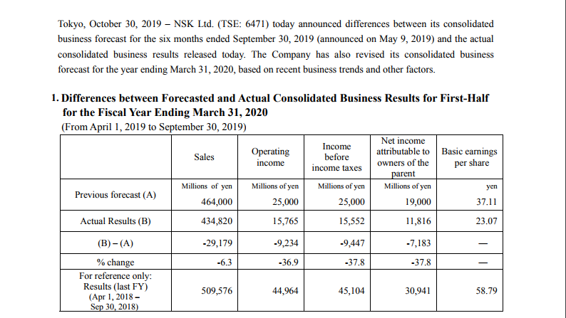 NSK Announces Differences between Forecasted and Actual Consolidated Business Results for First-half for the Fiscal Year Ending March 31, 2020 and Revision of Year-end Consolidated Business Forecast