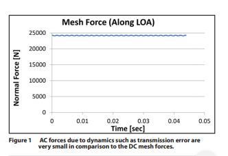 The forces acting in the gear mesh are made up of DC and AC forces. The DC mesh force is the necessary static force required for the gears to transmit power. This force is present by design. Static forces cause certain design challenges such as bearing life and shaft and housing deflection, but they don’t cause gear noise. Gear noise is the result of the AC forces from transmission error, shuttling, and friction, and are unintentional. These dynamic forces are tiny in comparison to the static forces. In the example to be discussed later, the DC mesh forces are in the magnitude of the weight of a pickup truck while the AC forces are less than a bag of dog food (Fig.1). It is only these small AC forces that we are interested in from a noise perspective. Because all the bearing forces are resolved within the gearbox, summing all bearing reaction forces on the housing results in zero, yet there is noise. That is because the forces act on various locations of the gearbox.Consider the two gear mesh of Figure 2. These transmission error forces at the bearings are in phase, that is, they reach maximum values simultaneously (assuming the gears’ and shafts’ first natural frequency is sufficiently greater than the mesh frequency).