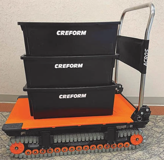 Creform Corp. a manufacturer of unique products for the design and building of material handling structures and automated guided vehicles, has designed a unique cart titled, ACROS. ACROS is a cart designed to be used on challenging terrains such as snow, soil, sand, mud, grass, rough concrete, and even steps. Suitable for transportation in cities, snowy areas, unpaved regions, agricultural sites, construction zones, or leisure activities. The ACROS cart uses a roller track system instead of casters to provide easy rolling, positioning, and maneuverability in all types of terrain, including rough industrial floors. The ACROS roller track frames are available in two versions: the AX-800 and the AX-900. The AX-800 version dimensions are 790mm W x 98mm D x 192mm H. The AX-900 dimensions are 890mm W x 98mm D x 192mm H. The two sizes are available for small hand-pushed cart or for a heavier load cart. The unit is constructed with rust-resistant materials and can be fully washed for maintenance. The surface of the cart comes in five colors: khaki, olive green, navy, orange, and black. The overall cart platform dimensions are 615mm W x 900mm D x 940mm H (handle). The loading height is 226mm, making it easier to load and unload items. The low height provides stability and allows the cart to be easily maneuvered. ACROS has three customizable handle modes allowing for switching between different transport modes, based on the task at hand. The ACROS cart can be customized to specific needs based on usage and items being transported.