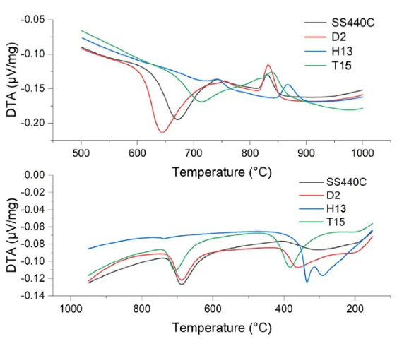 DTA during isochronal heating can record phase transformations or reactions associated with release or uptake of heat (calorimetry). Upon heating, the powders 440C, D2, and T15 undergo an exothermic reaction in the temperature range of 620-750°C, which can be attributed to (partial) decomposition of austenite, presumably via eutectoid decomposition, i.e., alloy pearlite. This transformation is most pronounced for 440C and least pronounced for T15, which correlates with the amount of retained austenite in the initial condition. A second peak, occurring between 800-900°C for all materials, is attributed to the formation of austenite (Ac1). Examination of the DTA signal (Figure 2) indicates that the austenitization start temperature for SS440C is approximately 820°C, with complete transformation at 850°C. For D2, austenitization begins around 820°C and completes at approximately 860°C. In the case of H13, austenitization starts at around 850°C and concludes at about 900°C. For T15, austenitization commences at around 810°C and is complete at approximately 875°C.
