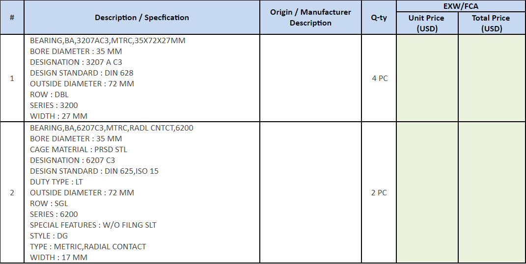 Please provide your best quote for the BEARINGS as per below specifications: