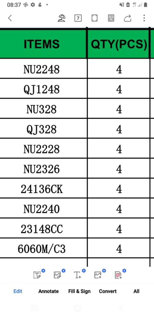 ITEMS QTY(PCS) NU2248 4 QJ1248 4 NU328 4 QJ328 4 NU2228 4 NU2326 4 24136CK 4 NU2240 4 23148CC 4 6060M/C3 4
