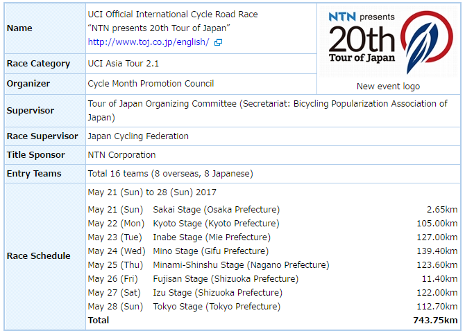 TOJ is the highest-level UCI (Union Cycliste Internationale) official international cycle road race to be held in Japan. This year marks the 20th time the race has been held, and the first time NTN is the title sponsor of the event. This year the race spans a total of eight stages over eight days, starting with the Sakai stage (in Osaka) on May 21 (Sun) through to the Tokyo stage (in Tokyo) on May 28.
