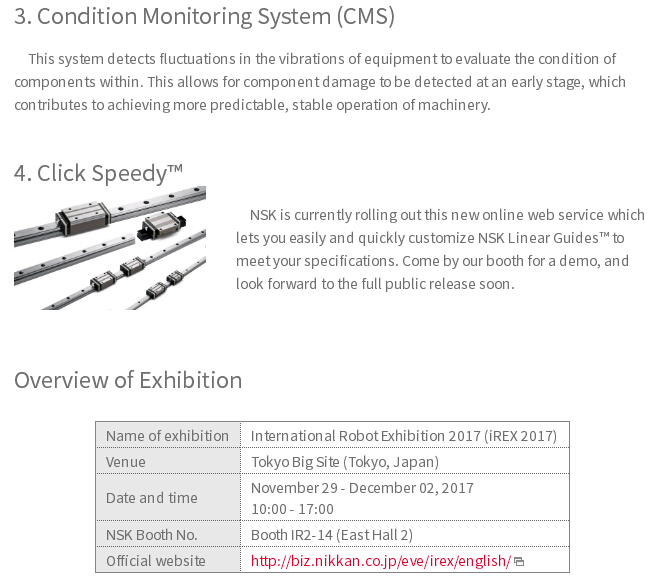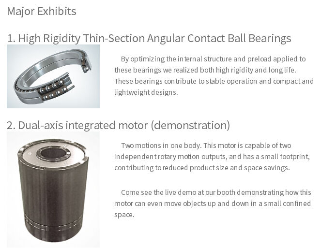 NSK aims to help realize the harmonious cooperation and coexistence of humans and robots in the manufacturing context. Under the theme Your Real Partner.™, NSK will exhibit leading edge technologies that contribute to high efficiency, long product life, and stable operation, including actuators incorporating Megatorque Motor™ technology, NSK proprietary condition monitoring systems, and a wide variety of solutions contributing to IoT and smart factory integration. Come to NSK to make your ideas reality.