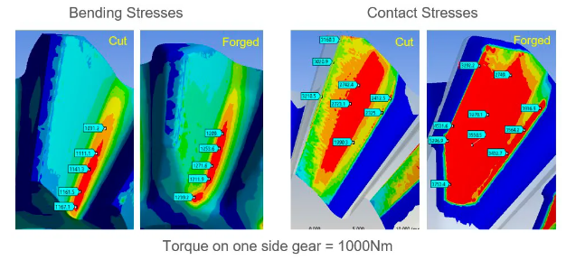A root bending stress and surface stress comparison between Coniflex Pro cut and forged gears was performed with the ANSYS Finite Element Method. The Coniflex Pro differential gear set was designed to replace the originally forged version. Also, a model of the side gear spline was created, and the input torque was transmitted from the splined shaft via the internal spline in the side gear bore to the side gear teeth. A torque of 1,000 Nm, which reflects the duty cycle peaks of a midsize EV, was applied. The bending stress results to the left in Figure 8 show a considerable advantage of the cut side gear (i.e., the cut pair). It is noticeable by the red patch inside of the web area at the toe that the web restricts the necessary tooth deflection in this critical area, resulting in twice the bending stress of the cut gear. The high load contact area in the right-side graphics (red) fades out smoothly on the Coniflex Pro cut gear but extends to tip and root on the forged version. This proves the advantageous function of the Coniflex Pro tip relief. Also, the contact stress magnitudes in Figure 8 show up to 65 percent higher values of the forged gear. The especially the high value of 3,753N/mm² in connection with the high bending stress in the same area will result in high sub surface stresses which can cause case crushing. Case crushing often leads to flank fracture.