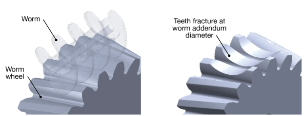 The guideline presents a model for evaluating worm wheel tooth fracture load-carrying capacity. While the precursor guideline, the VDI 2545, considered bending root stress as the main fatigue failure criterion (leading to root crack induced failure), the updated 2736 guideline assumes that fracture predominantly occurs at the edge of the worm (i.e., at its addendum diameter, see Fig. 4) and considers instead the shear fatigue stress as being the one leading to this type of failure.