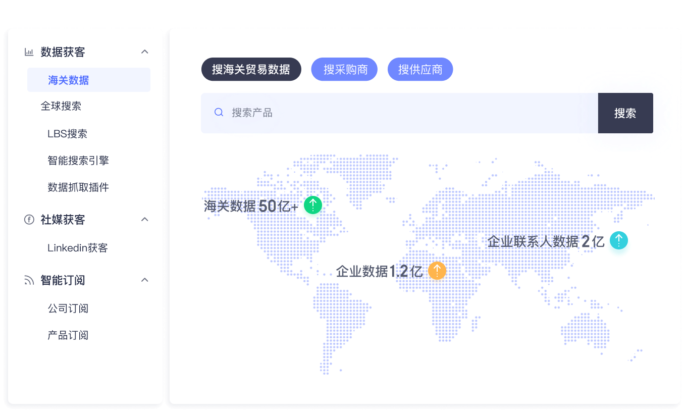 AI智能挖掘海关数据、社媒数据、搜索引擎数据等全网数据 数据全天候实时更新 AI自动匹配关键人联系信息