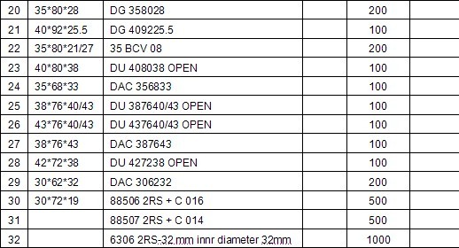 Demand bearings[Indonesia] Pls quote to me bearing as follow: 1) NU320 (3pcs) 2) SKF NU2215 (6PCS) 3) SKF NU3312 (6PCS) 4) SKF 6309 (70PCS) 5) SKF 6217 ZZ (4PCS) 6) SKF NU309EC (3PCS) 7) 6208 (6PCS) 8) SKF 6307-ZZ (6PCS) 9) 6307 (30PCS) 10) 6306 (80PCS) Thank you you for your attention and waitingg your best quotation. Regards【Indonesia】