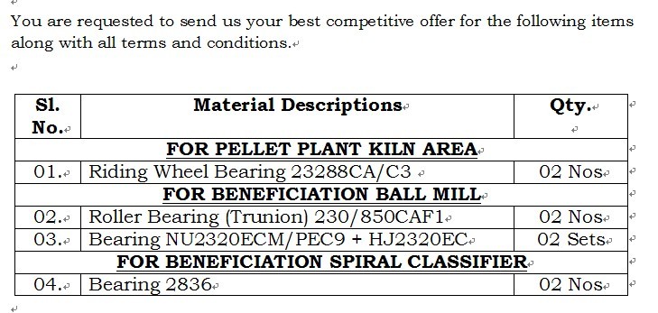 Quotation required Urgently[India] Hi, Please send rates for the below mentioned items in chinese make. Sl. No. Material Descriptions Qty. 01. Riding Wheel Bearing 23288CA/C3 02 Nos 02. Roller Bearing (Trunion) 230/850CAF1 02 Nos 03. Bearing NU2320ECM/PEC9 + HJ2320EC 02 Sets 04. Bearing 2836 02 Nos Please give the following 1. Rates for CIF- Kolkata, India 2. Availability 3. Delivery time / Schedule 4. Payment terms【India】
