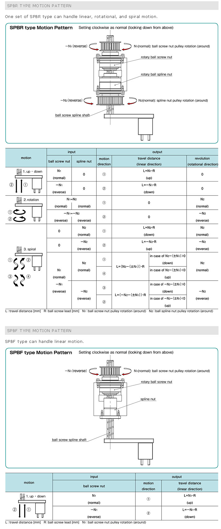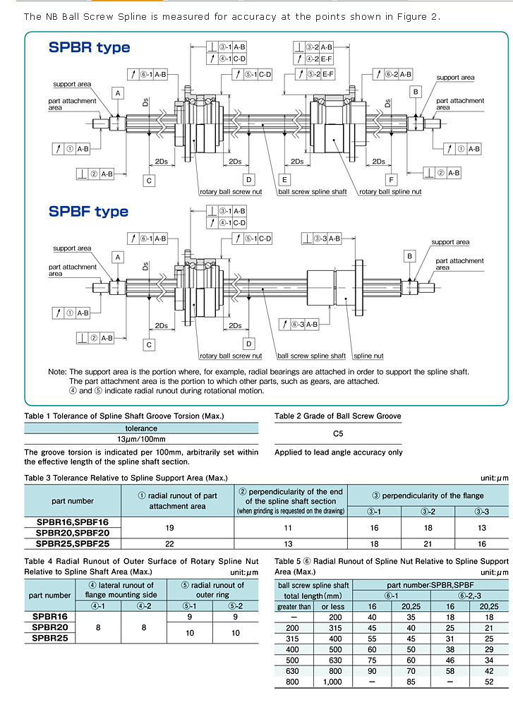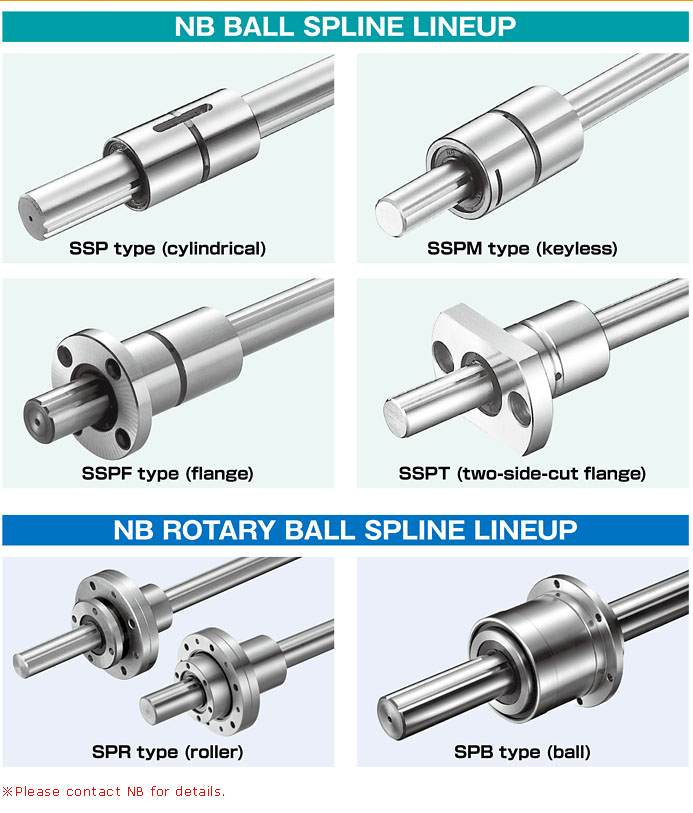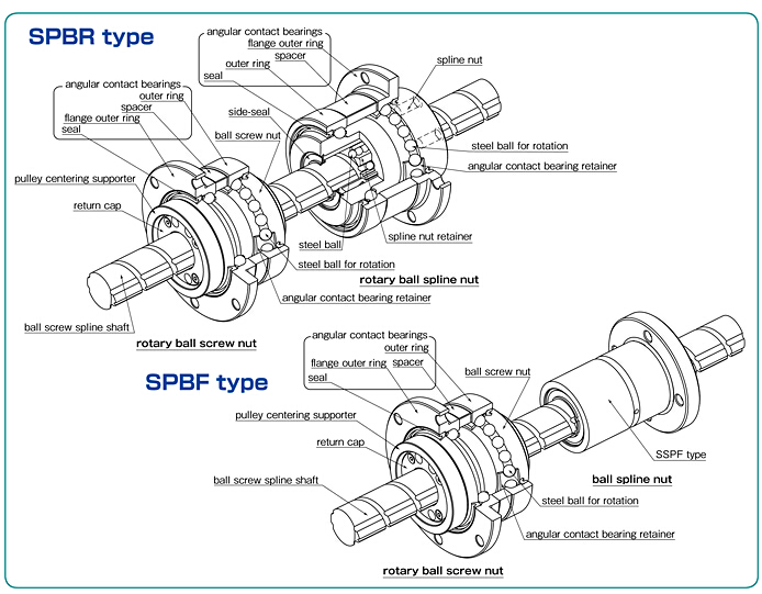The NB Ball Screw Spline consists of a high accuracy, high rigidity Ball Screw nut and Ball Spline nut attached to the ball screw spline shaft which has a screw groove and spline grooves. SPBR type has a Rotary Ball Screw nut and Rotary Ball Spline nut. Rotary Ball Screw nut is an integration of ball screw nut and angular contact bearings. Rotary Ball Spline nut is an integration of ball spline nut and angular contact bearings. SPBF type has a Rotary Ball Screw nut and a Ball Spline nut.