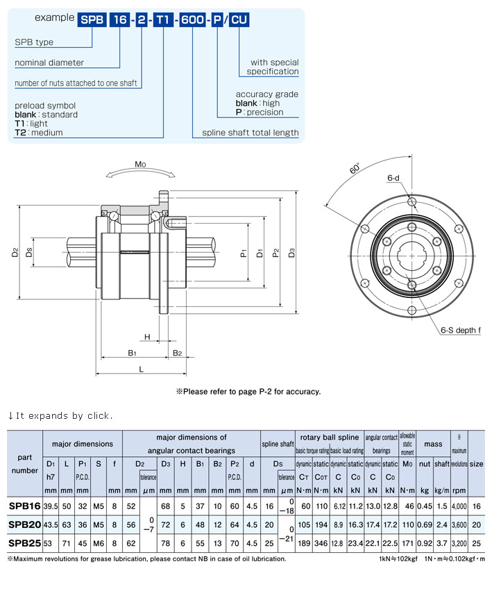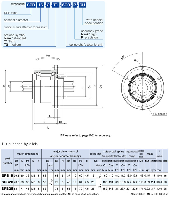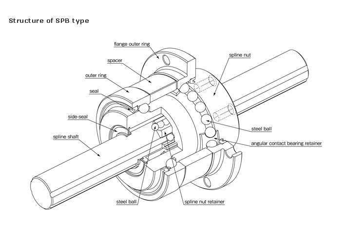 STRUCTURE AND ADVANTAGES The NB ROTARY BALL SPLINE SPB type combines a spline nut and a set of angular contact bearings in a compact, high accurate, and high-speed rotation-capable assembly, providing both linear and rotational motion at the same time. Structure of SPB type